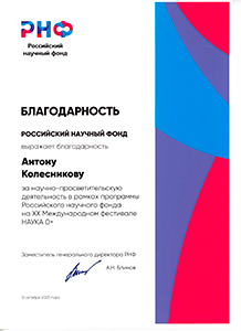 Российский Научный Фонд выражает благодарность Антону Колесникову за научно-просветительскую деятельность в рамках программы